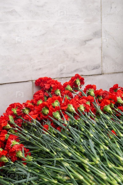 Красные цветы гвоздики в букете на фоне белого мраморного стены