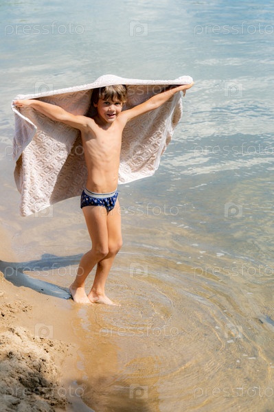 Маленький мальчик стоит в воде с полотенцем на плечах