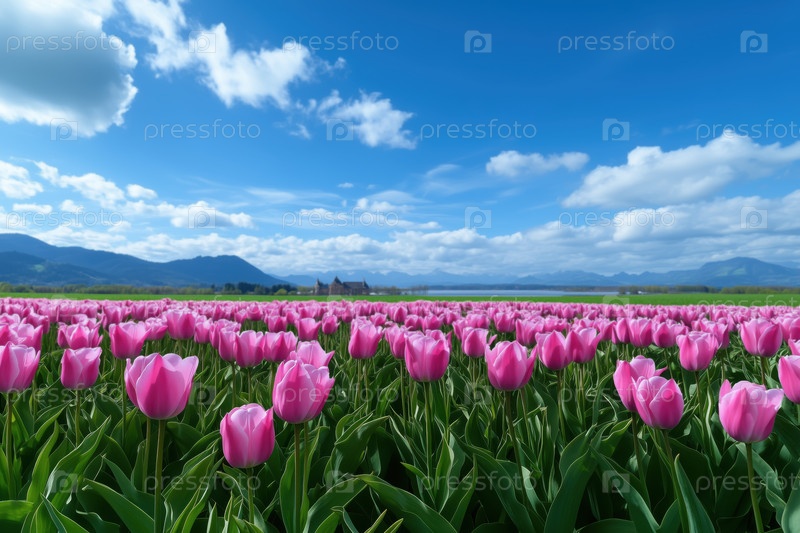 Поле тюльпанов с размытой сельской местностью позади