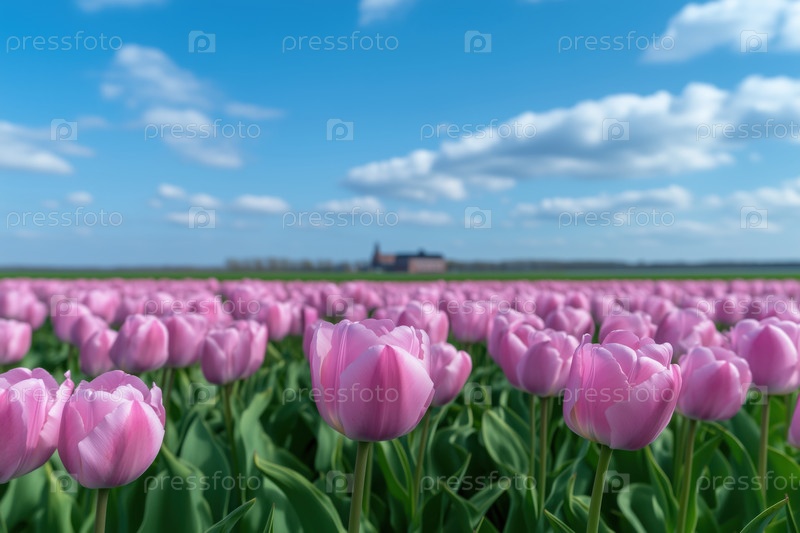 Розовые тюльпаны на сельскохозяйственном поле весной