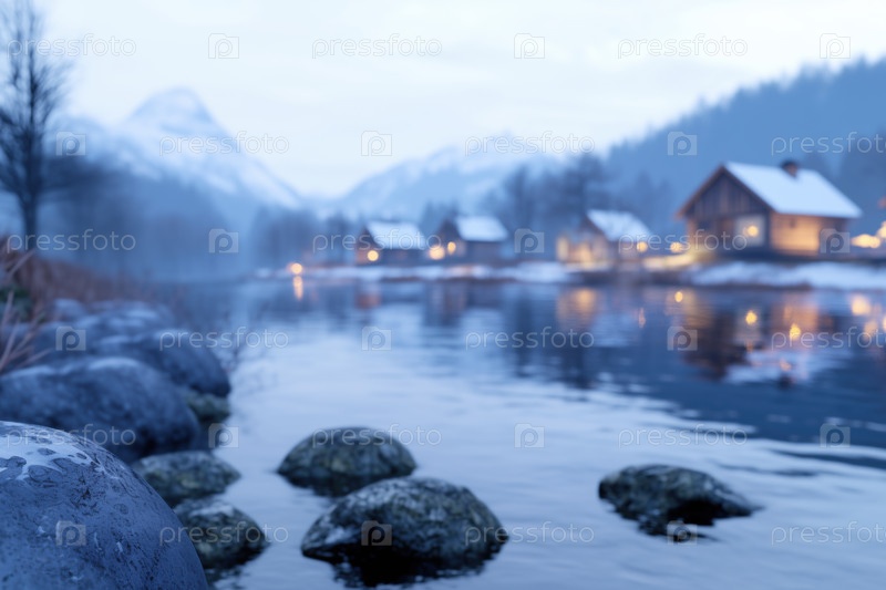 Горная деревня на озере ночью. размытый фон