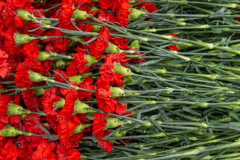 Цветы красного гвоздика на цветочном рынке, фото вблизи