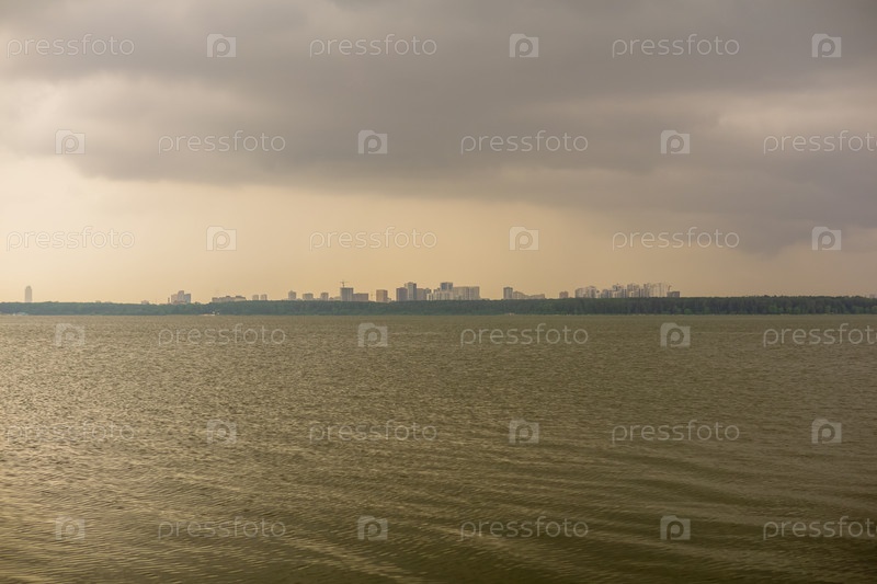 Драматическое небо над озером с городским пейзажем на заднем плане