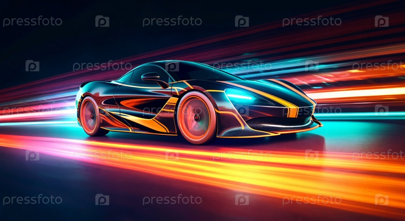 Футуристический фантастический автомобиль на шоссе с неоновым освещением