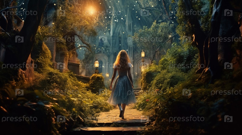 Обратный вид женщины, идущей по сказочному лесу, где магия природы переплетается с ее изящным присутствием