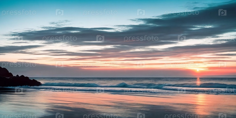 Впечатляющий морской пейзаж с камнями, установленными на фоне красочного заката солнца на горизонте. Панорама. Генеративная ИИ