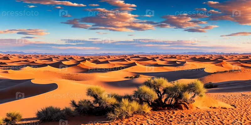 Огромное пустынное пространство с катящимися дюнами под солнечным небом
