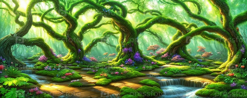 Мистическая красота зачарованного леса. яркие зеленые насаждения, извивающиеся лозы и мерцающие лучи солнечного света фильтруются через навес. генерируя ИИ