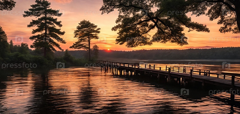 Яркий закат красит небо над тихим лесным пиром озера Отражает золотые оттенки в спокойных водах ниже Generative AI