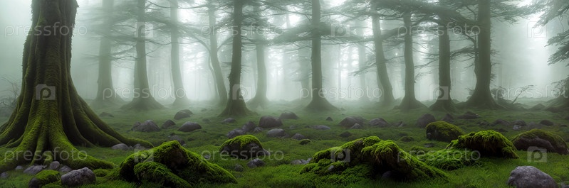 Древние деревья, покрытые туманом, камни, покрытые мхом, свет фильтруется через листья