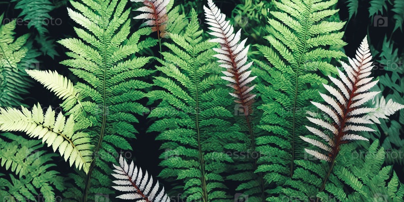 Элегантность природы. пышный зеленый ботанический фон, наполненный различными видами папоротников, листьев и листочков. Панорама