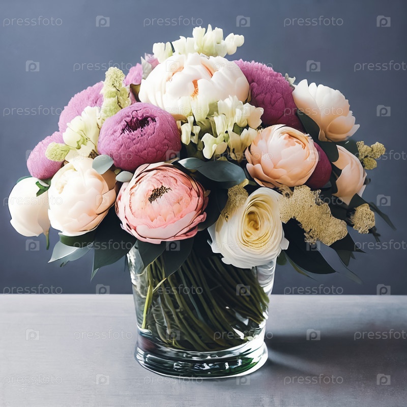 Яркий букет весенних цветов расположен в стильной вазе с мягким естественным светом, чтобы символизировать элегантность и женственность