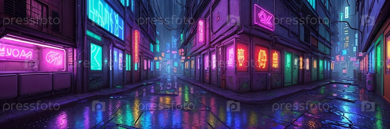 В киберпанк-улице неоновые знаки бросают сильный свет на голографические граффити, пропитанные дождем тротуары