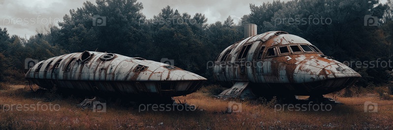 Заброшенный космический корабль на инопланетной планете, ржавый металл, разбитые окна, заросшая растительность восстанавливают корабль