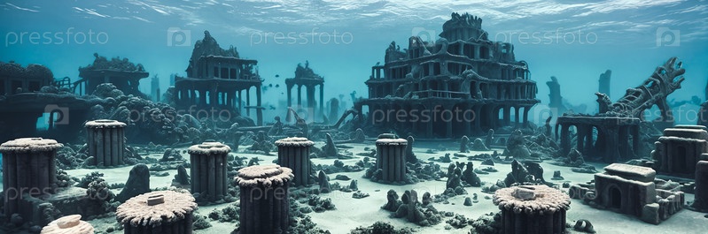 Откройте для себя мистические глубины подводных руин. затопленные здания, коралловые колонны, скоты экзотических рыб ползут по улицам. Погрузитесь в очаровательные остатки потерянного города. генеративный ИИ