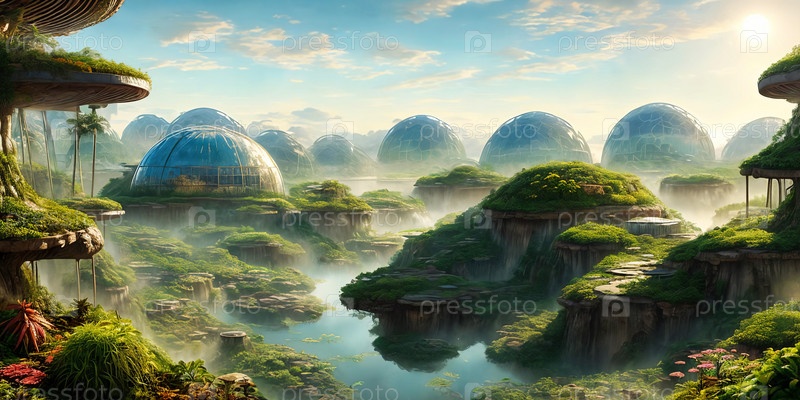 Яркий биод на чужой планете. разнообразные экосистемы, искусственные, биоинженерии. футуристический оазис полный инноваций жизни