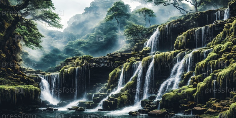 Величественный водопад, каскадирующий с скалистой скалы в окружении пышной зелени