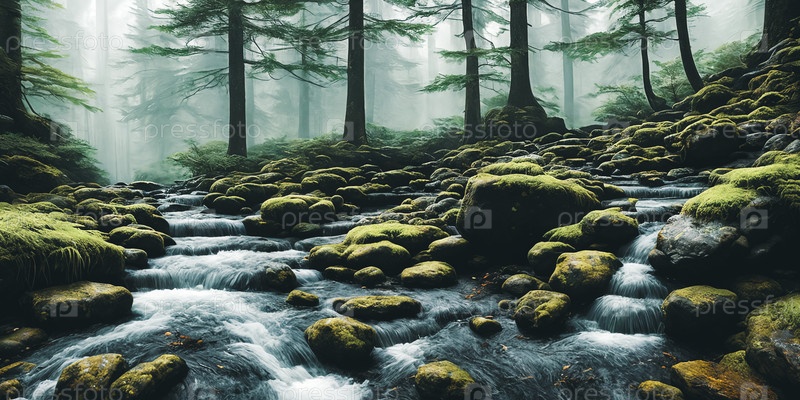 Текстура элементов сцены, таких как зубчатые камни, каскадная вода и раскачивающаяся листва