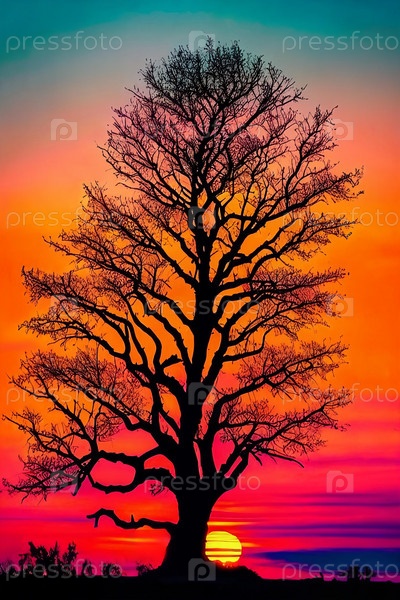 Одинокое дерево против яркого захода солнца на небе