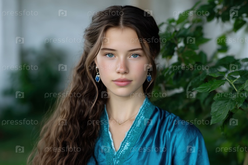 Портрет красивой девушки с длинными волосами в голубом шелковом платье