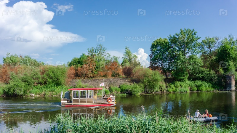 Россия - 2023 год, 26 июня: небольшая туристическая лодка идет вниз по реке