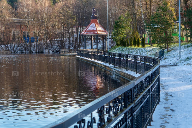 Светлогорск, Калининград, Россия - 2023 г., 5 февраля: пешеходная тропа в парке зимой. прогулка по Музе-парку вокруг озера Тихо