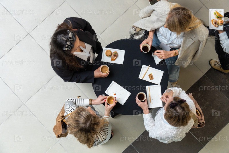 Четыре женщины-менеджеры наслаждаются кофе и десертами во время обеденного перерыва