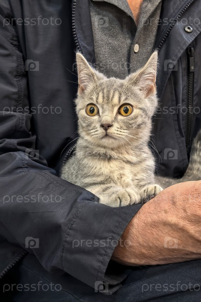 Серый котенок удобно отдыхает в руках у мужчины