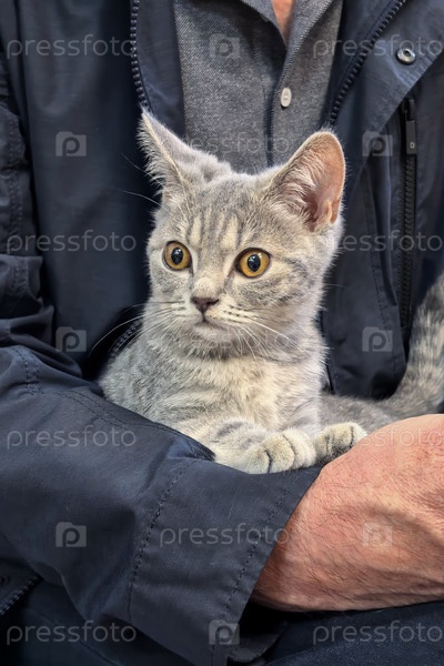 Серый котенок удобно отдыхает в руках у мужчины