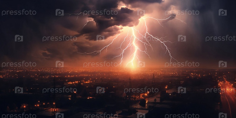 Городской горизонт представляет собой силуэт на фоне облачного темного неба с молниями.Панорама.Генеративный ИИ