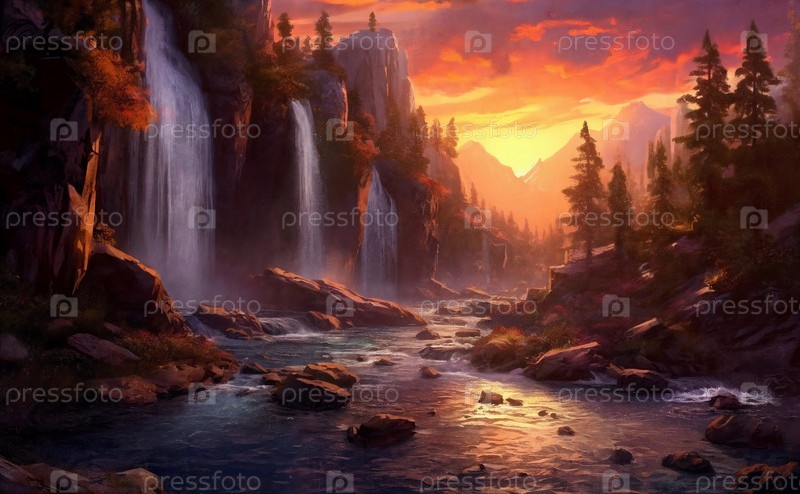 Фантастический пейзаж с водопадами, панорама заката