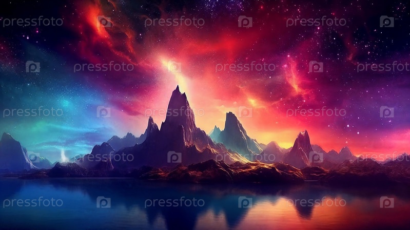 Фантастическая планета с озером на переднем плане, горами и ночным небом со звездами и туманностями в фоне