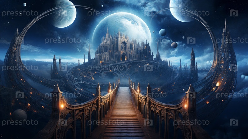 На огромном пространстве простирается великолепный мост, созданный из фантастических элементов, соединяющих неизвестные миры