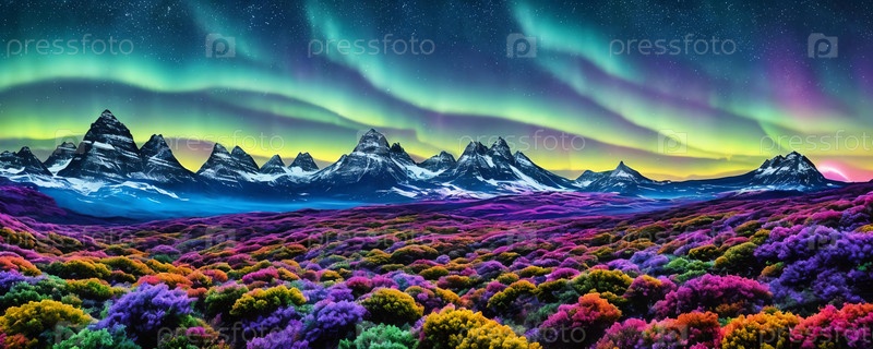 Небесная планета. Планета с несколькими лунами, красочные растения на переднем плане. Панорама. Генерация ИИ