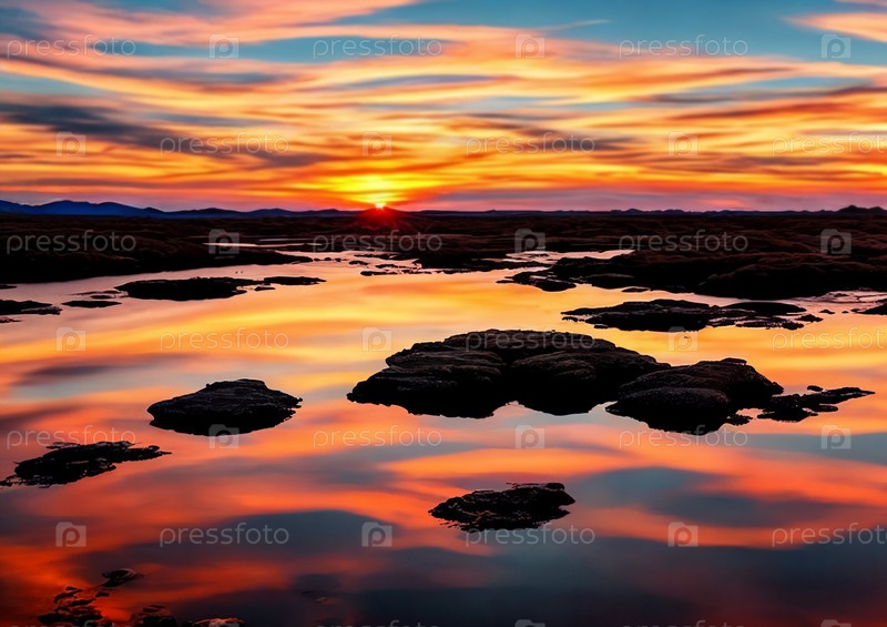 Яркий закат солнца рисует небо над безмятежным озером, его цвета отражаются на спокойных водах и освещают рассеянные камни