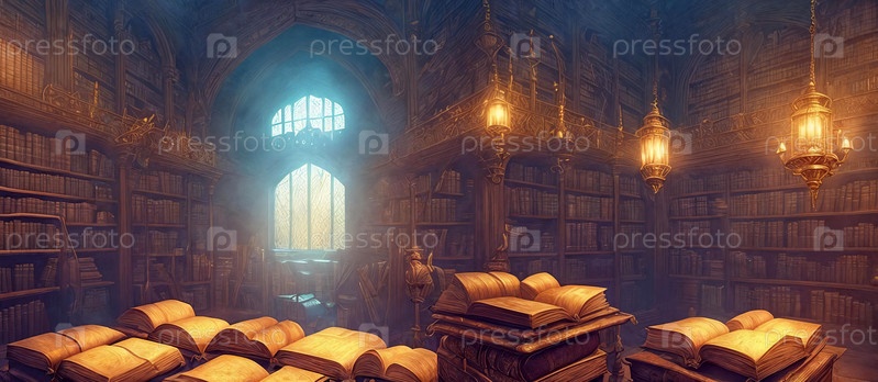 Магическая библиотека с витриной высоких полок древних томов. генеративный ИИ