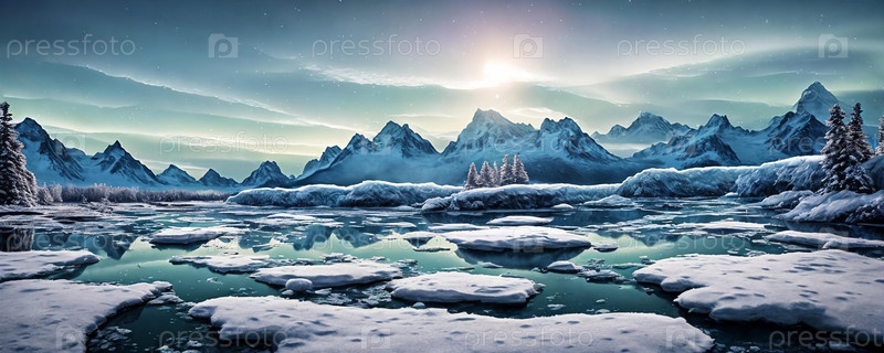 Замороженная планета тундры, холодный ледяной мир с возвышающимися ледниками, заснеженными горами и льдовитыми реками