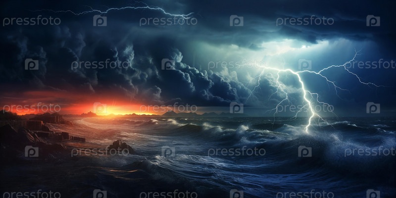Бурное море под темными облаками с разрывающимися молниеносными волнами. бурные воды отражают чувство силы и опасности. генеративный ИИ
