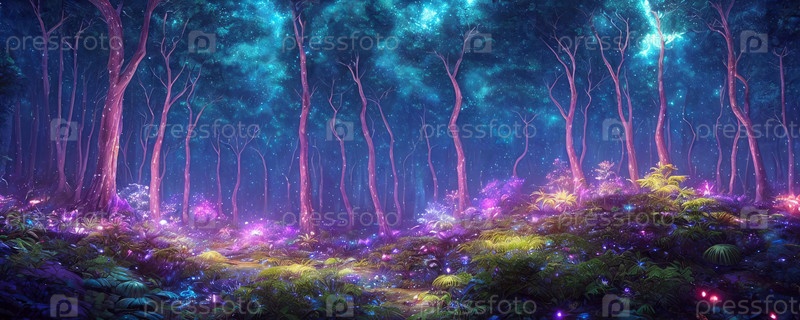 Мистический лес ночью с флуоресцентными растениями и светлячками, освещающими сцену