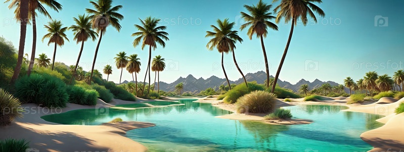 Скрытый оазис в пустыне с изумрудно-зеленой водой, пальмами и волшебными песчаными дюнами, которые меняют форму