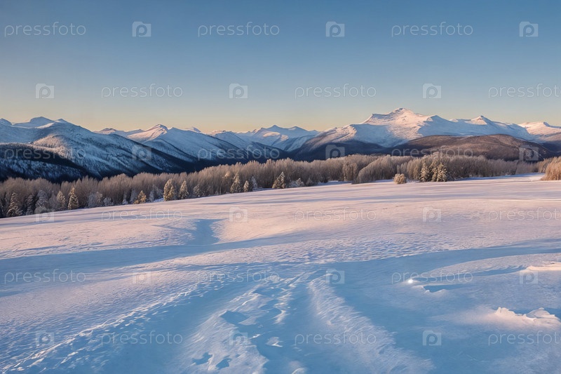 Спокойный зимний пейзаж, живописная панорама.Заснеженные ландшафты, замерзшие деревья и зимние сцены