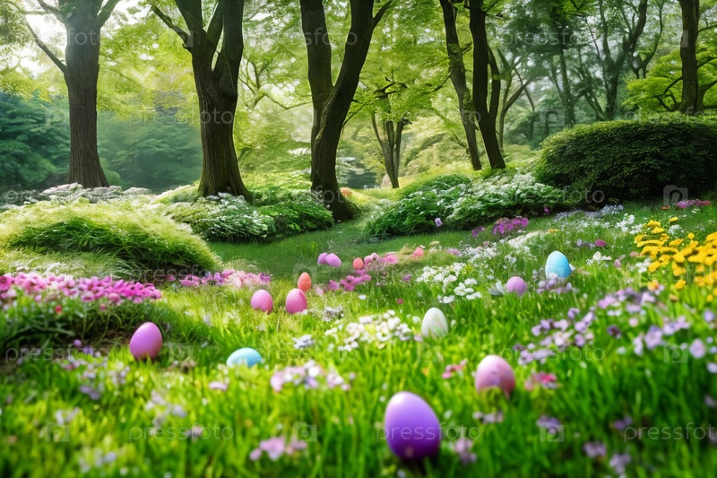 Странная сцена с скрытыми пасхальными яйцами, которые расположены среди пышной зеленой травы