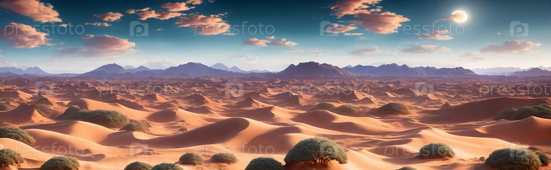 Огромное пустынное пространство с катящимися дюнами под солнечным небом