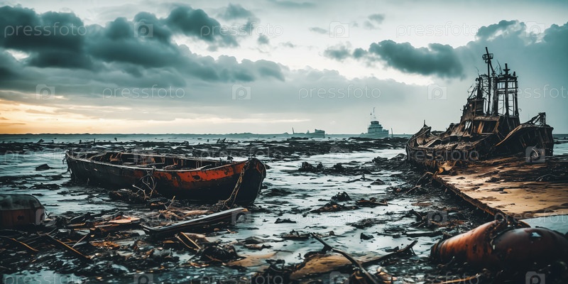 Постапокалиптическая прибрежная сцена с затонувшими кораблями, смытыми обломками и пустынной береговой линией с видом на огромное и беспощадное море