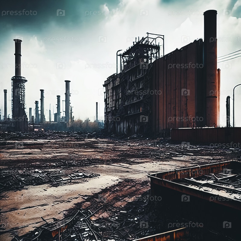 Индустриальная зона в упадке с заброшенными фабриками, ржавым оборудованием и загрязненным горизонтом создает сцену промышленного коллапса