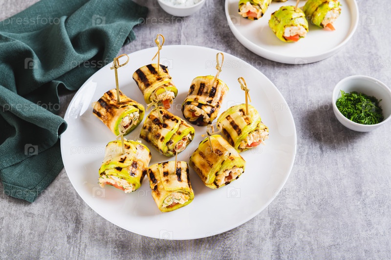 Нагретые рулоны из кабачков, заполненные сливочным сыром и помидорами на тарелке на столе