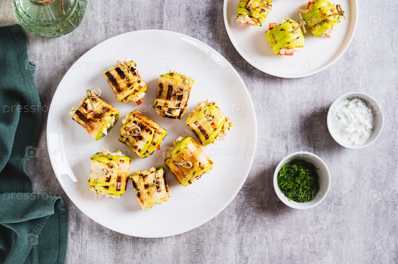 Перекус из кабачков с рикотой, помидорами и чесноком на тарелке на столе
