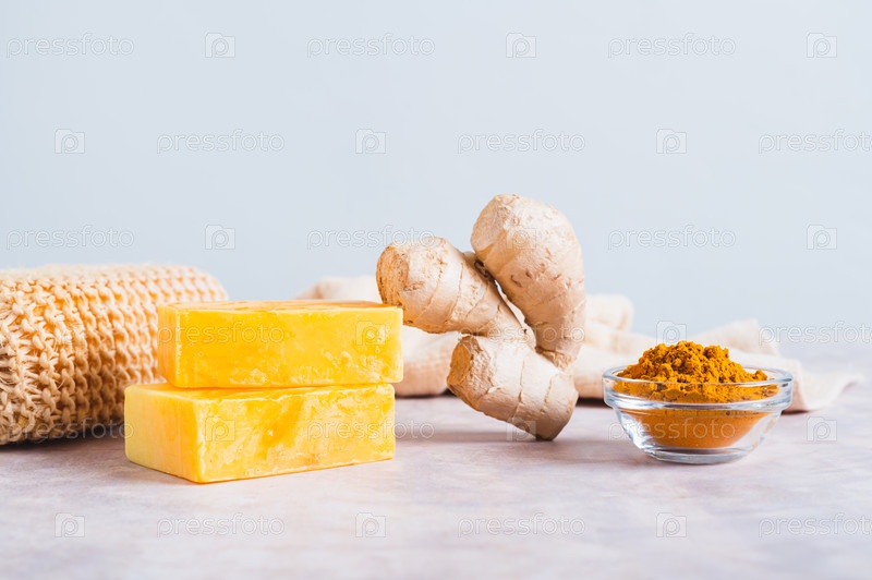 Домашнее натуральное мыло из куркумы и ингредиенты на столе