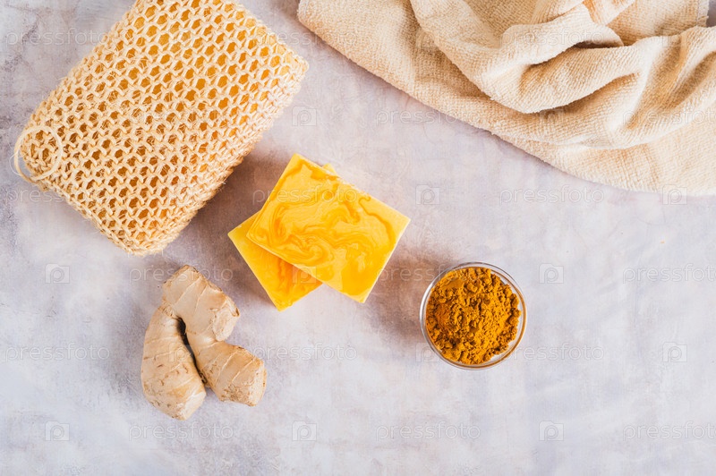 Домашнее натуральное мыло из куркумы и ингредиенты на столе