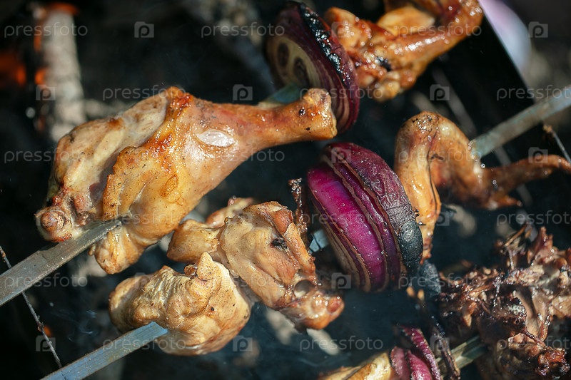 Печеный куриный кебаб вблизи с луковыми кольцами